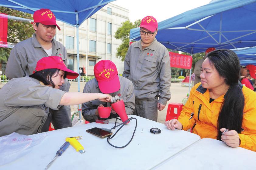 “小伙子,這個電烤箱壞了,你看能修好嗎?”“沒問題,我幫您搞定。”“這些相片可以幫我過塑嗎?”“可以,馬上就給您過塑”……上午9時許,活動剛剛開始,廣場上就聚集了許多群眾,面對群眾的每一個困難或疑問,志愿者都熱情解答,并一一動手解決。