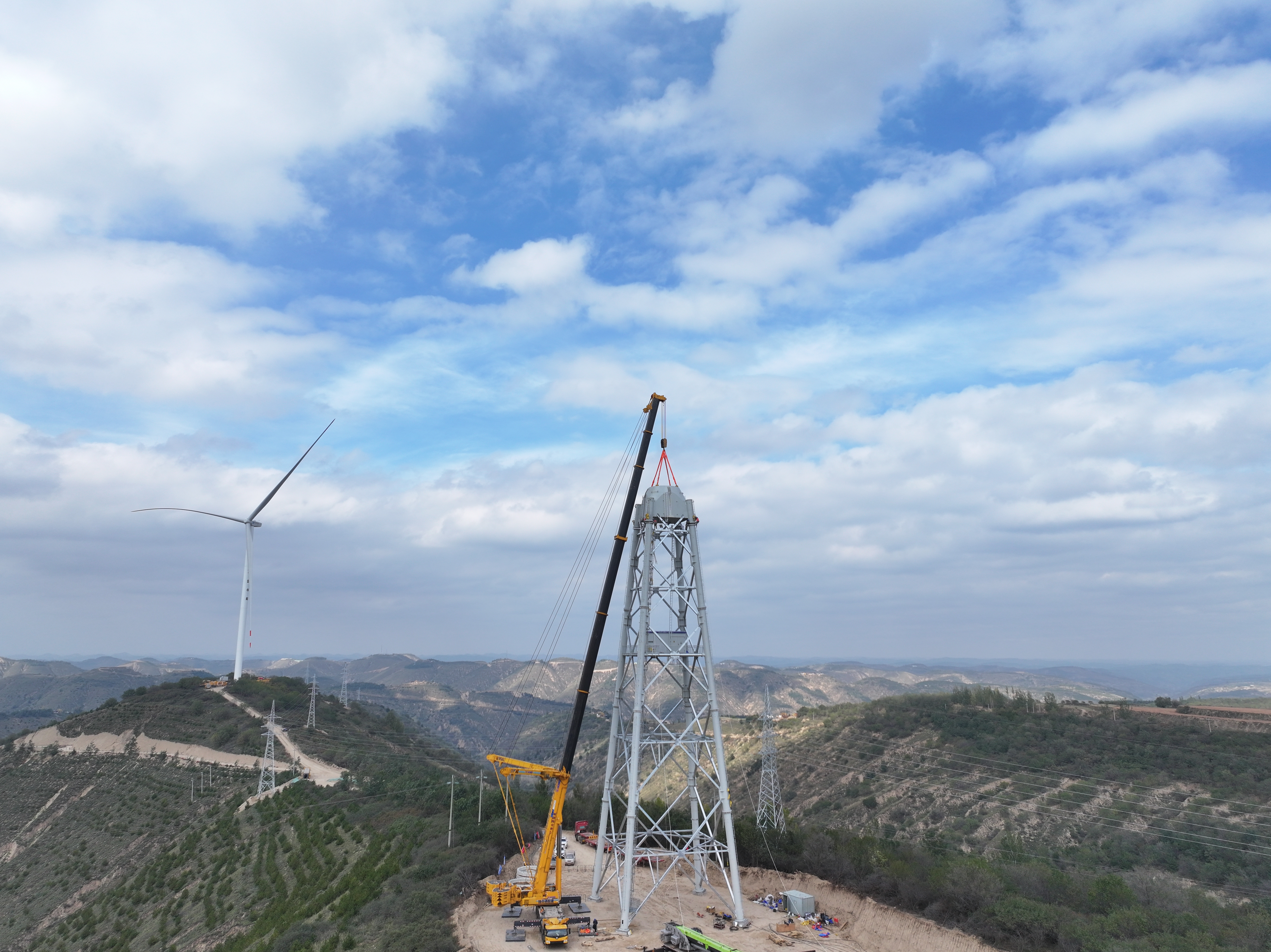 在施工作業(yè)現(xiàn)場,經(jīng)過多日的艱苦奮戰(zhàn),首臺構(gòu)架式風塔塔架及過渡段部分全部吊裝完成,這一里程碑式的進展,標志著項目進入了一個新的階段。